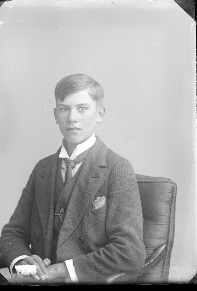 Porträtt av en pojke i tonåren. Han sitter i en stol.