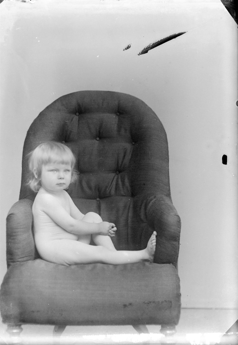 Porträtt av en naken liten flicka som sitter i en fåtölj.