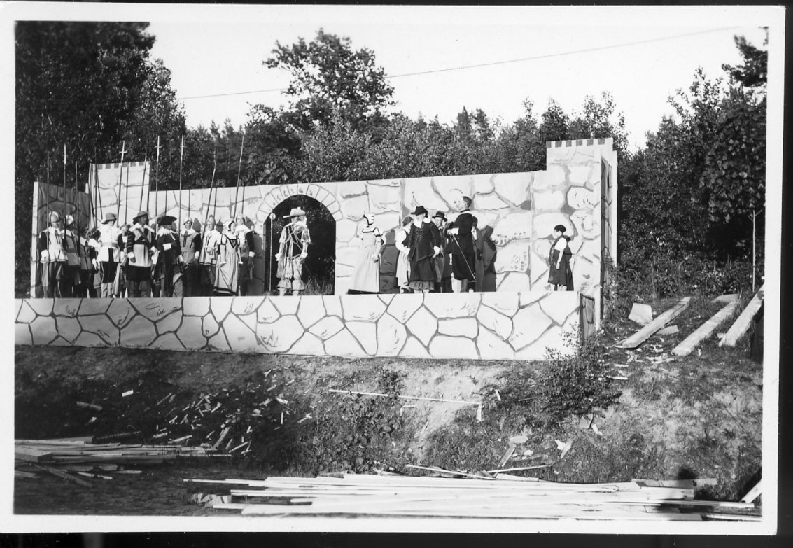 Amatörskådespelare på en scen med scenografi förställande en borg.