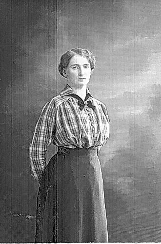 Porträtt av en ung kvinna i mörk klänning och rutig blus. Hon håller händerna bakom ryggen.