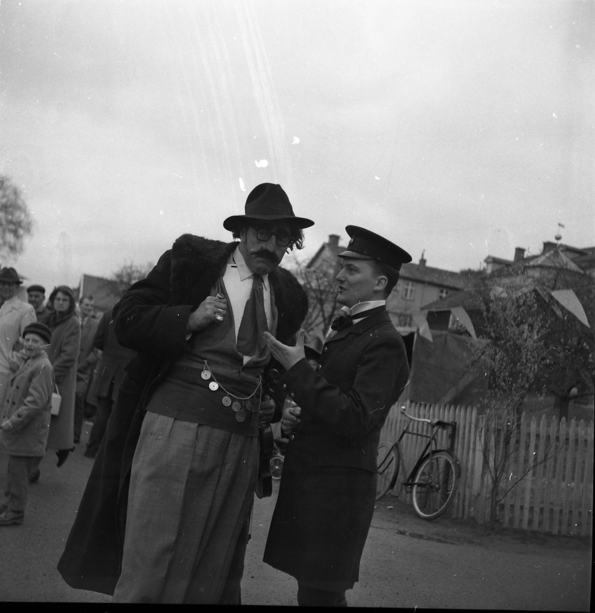 Två utklädda karaktärer står på norra delen av Sjögatan i Gränna och samtalar. En folksamling i bakgrunden. Mannen till vänster är Olle Mathias som "zigenare" och till höger Hans Roman oklar ämbetsuniform.