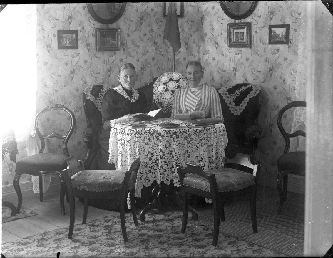 Två kvinnor, systrarna Bergenstråle, sitter i en soffa vid ett bord med spetsduk. De har en bok i händerna och det ligger böcker på bordet.
