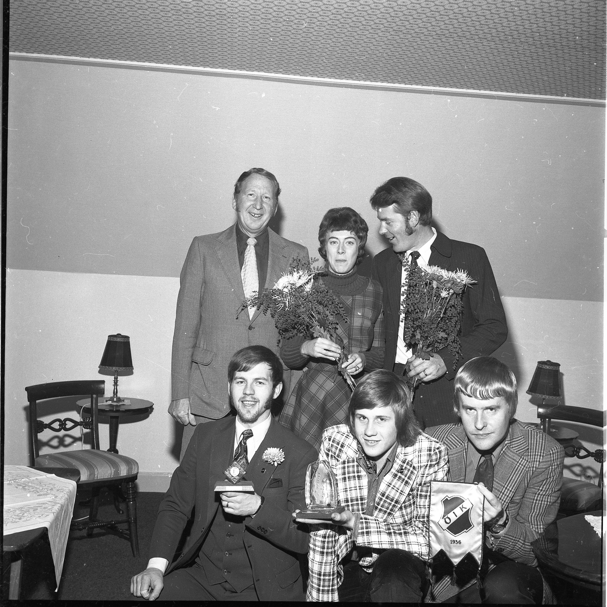 Fem män och en kvinna uppställda i två led, med blommor och utmärkelser i händerna.