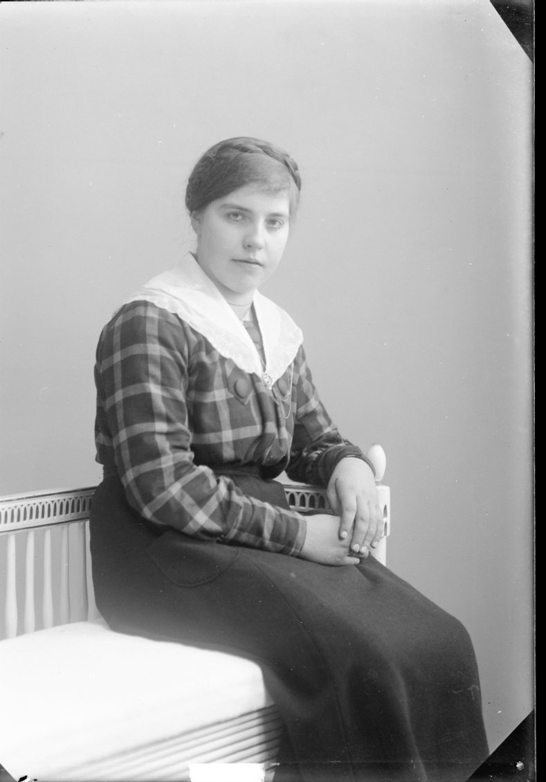 Porträtt av en flicka i tonåren som sitter i en soffa av gustaviansk modell. Hon är mörk kjol, rutigt livstycke och vit spetskrage.