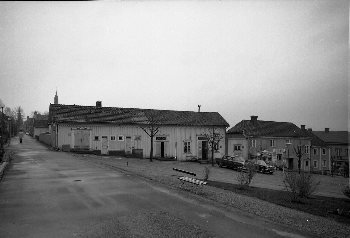 Bergsgatan söderut från torget, det har regnat. Bebyggelsen utmed torgets södra sida med bland annat Taxi - bilar av märket Mercedes Benz står parkerade utanför - och en randig kiosk som säljer Polkagrisar