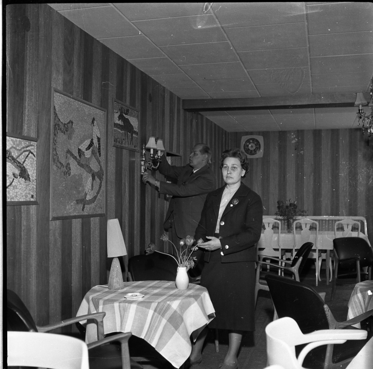 Ägarna, herr och fru Madsen i Ribbagårdens "mahogny-sal". Lauritz Madsen pysslar med väggarmaturen. På väggen till vänster hänger mosaiktavlor med djurmotiv.