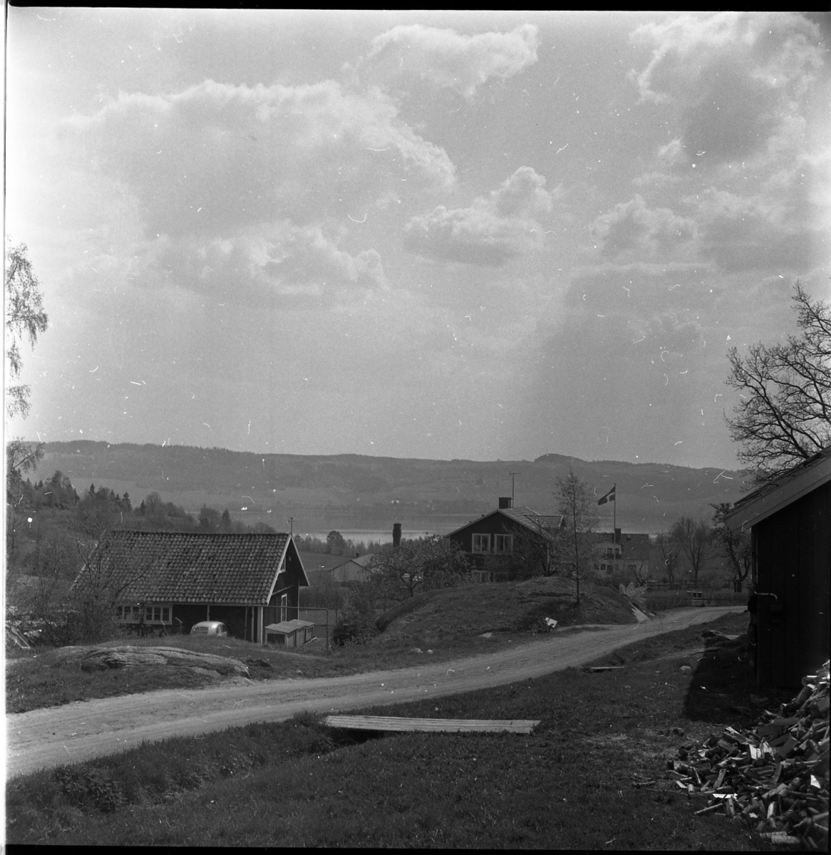 Vy över ett landskap. I förgrunden syns en grusväg, på andra sidan grusvägen ligger två röda hus. Bortanför husen skymtar en sjö. Fotot taget mot öster med Landsjön i mitten, Skärstad. Måla kulle syns i horisonten.