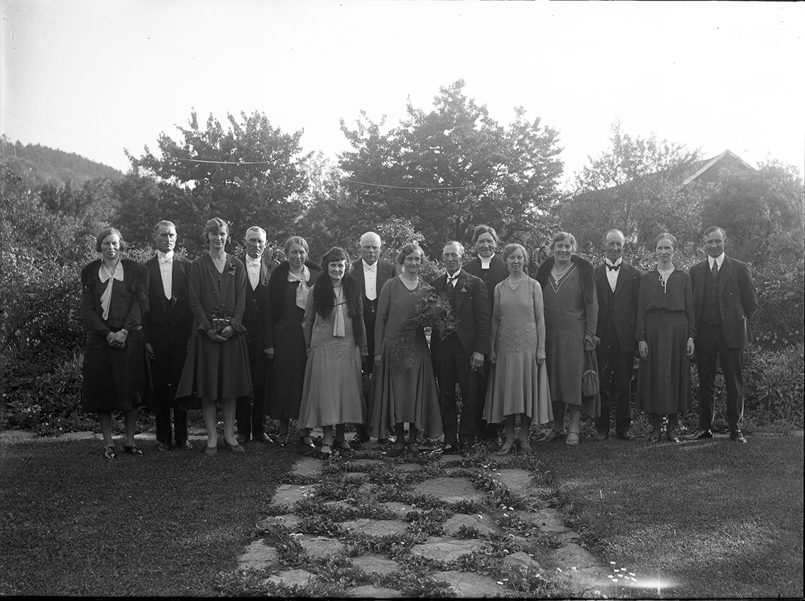 Högtidsklädda kvinnor och män i en trädgård. Ett äldre par i mitten, kvinnan med en bukett i händer. Snett bakom de står en präst. Möjligen en bild i samband med ett bröllop.