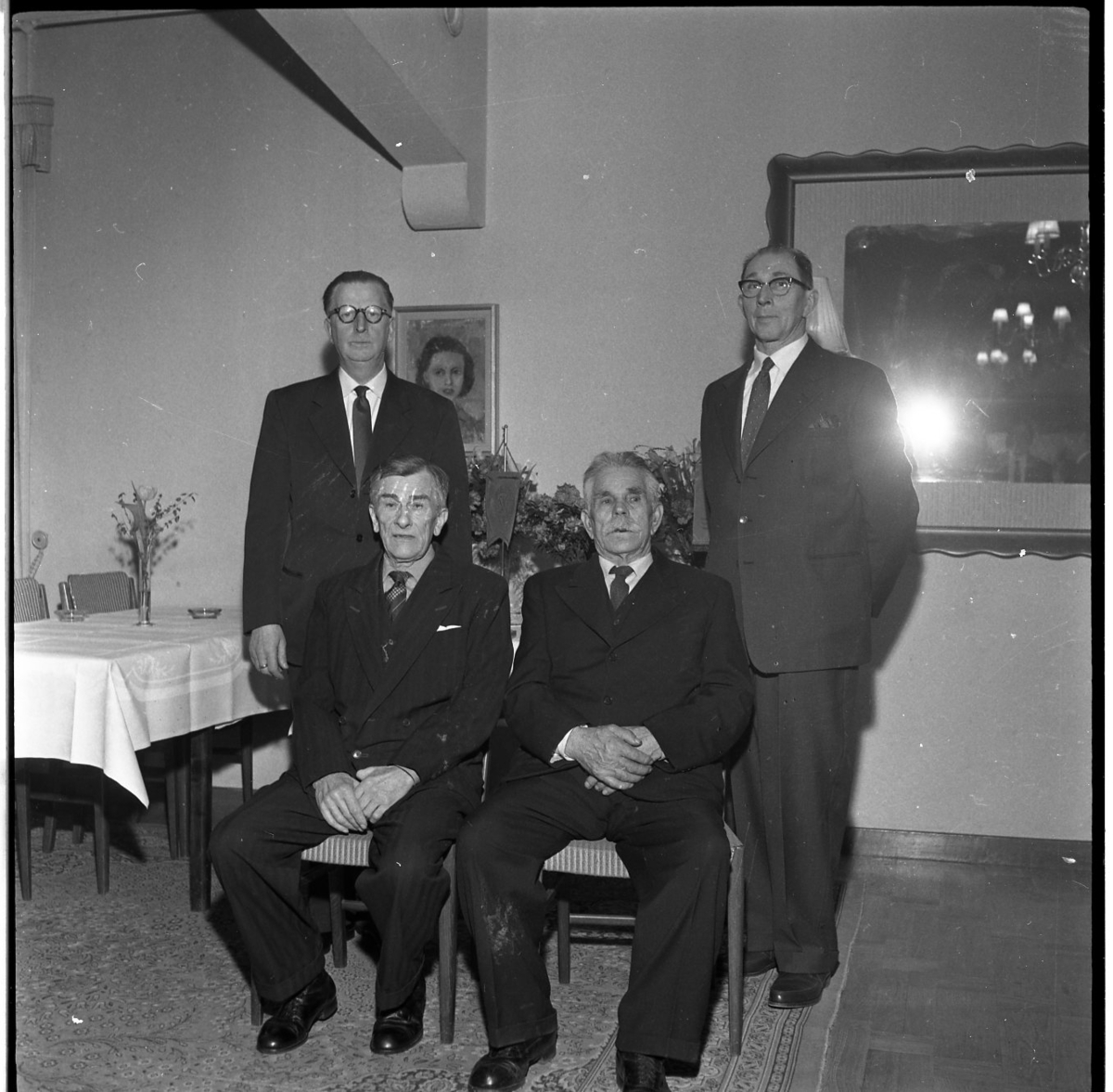 Titel: Fyra män poserar för fotografering. Två av den sitter på stolar och Ture Ekvall och en till står bredvid. De bär kavaj och slips.