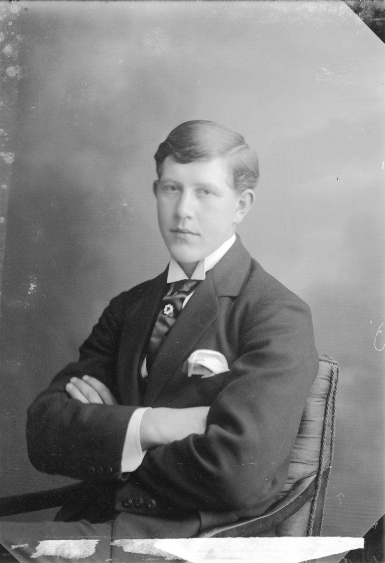 En ung man sitter i en fåtölj med armarna i kors. Slipsnål i form av en blomma.