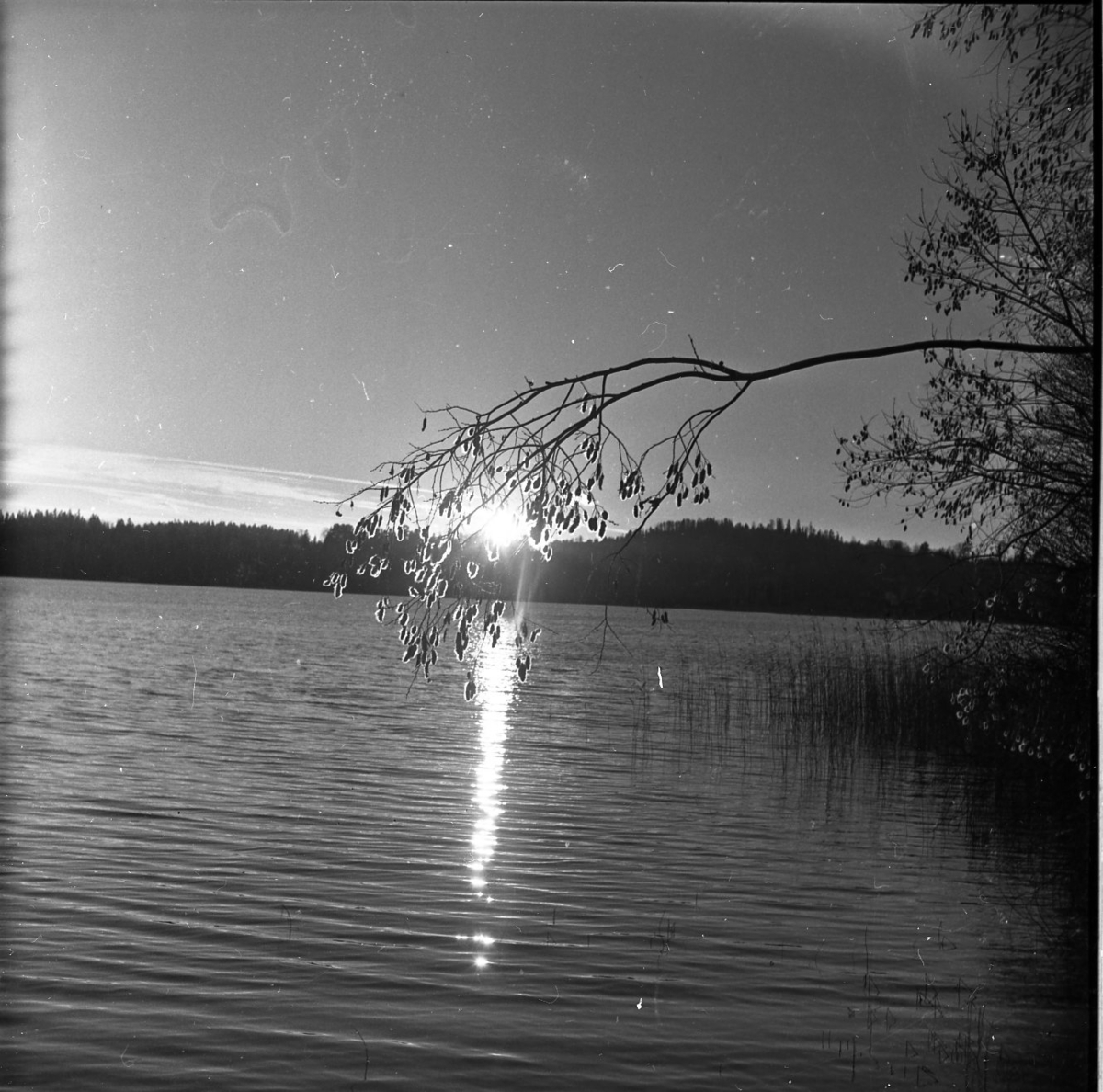 Solnedgång över okänd sjö. Solen skiner genom en trädgren med löv.
