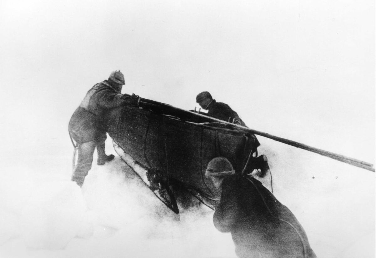 Isvandringen. Alla tre skjuter på båten surrad på en släde. Nils Strindberg till höger om båten (sköter trådutlösning), Knut Fraenkel till vänster och S A Andrée vid fören. Retuscherad version av gm.III-81.