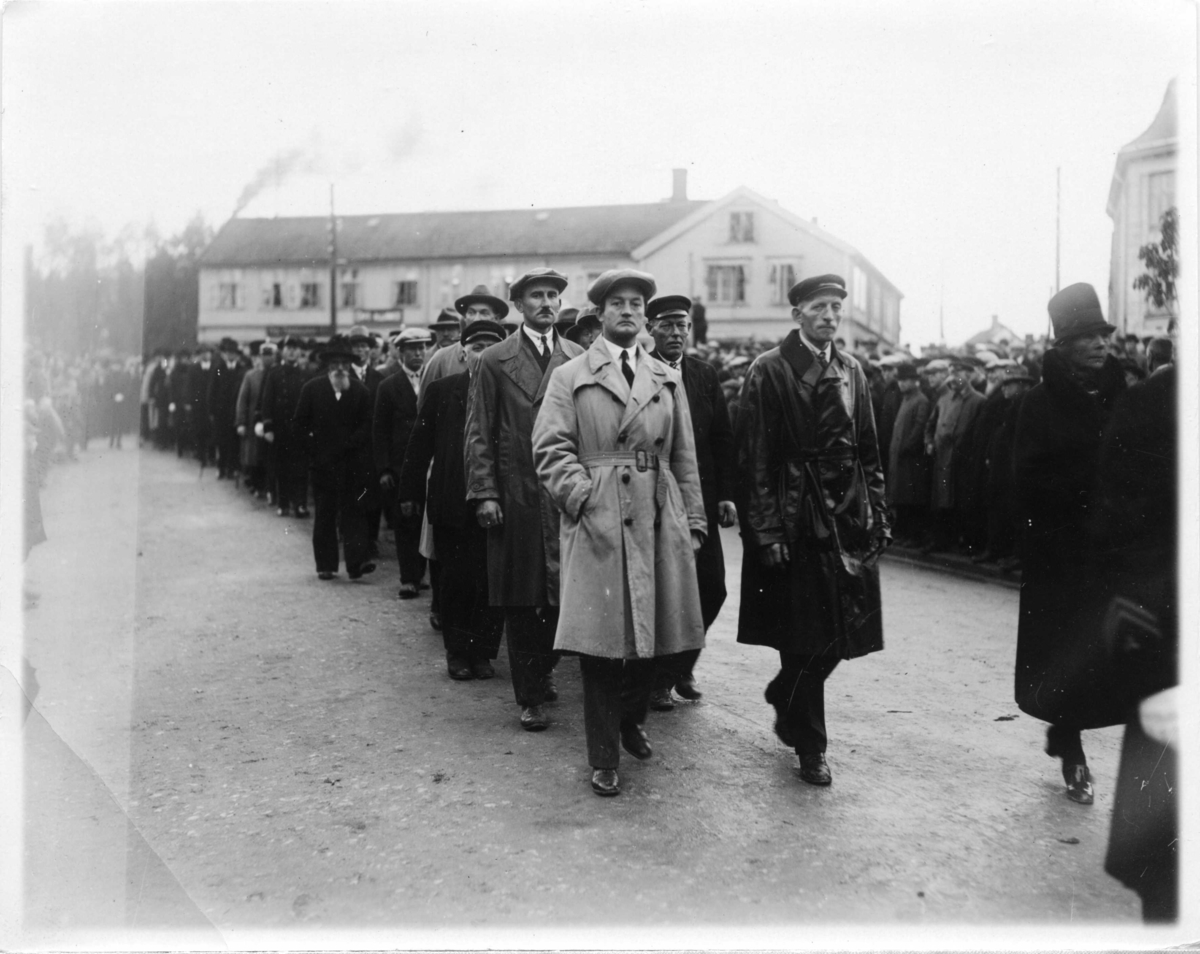 Vitöfynden förs till HMS Svensksund. Stubbendorff (i ljus rock) bredvid kapten Skogvik i täten för Isbjörns besättning. I andra led sannolikt Kristoffersen till vänster och Sörensen till höger. I tredje syns Myhre till vänster.
