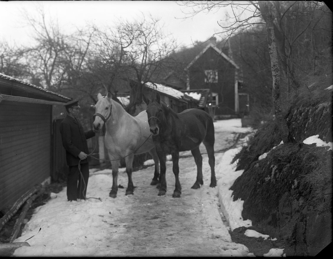 En man står med två hästar på en vintrig uppfart till ett hus längre upp i bild.