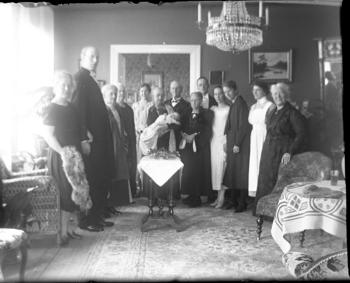 Hemmiljö. Tretton män och kvinnor står i en halvcirkel mot fotografen. I centrum står en äldre kvinna med ett spädbarn i famnen. I sällskapet finns en präst och en sjuksyster.
