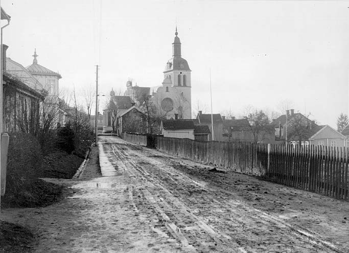 Bergsgatan i Gränna, från nuvarande Braheparken och söderut mot kyrkan. Långt spjälstaket till höger mot mark som senare blir park. Gatan är blöt, lerig och spårig. Den är möjligen stensatt.