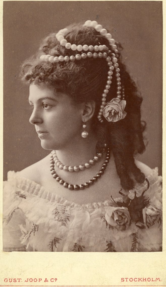 Kabinettsfotografi av en kvinna med en ros och pärlor i håret, även pärlhalsband.