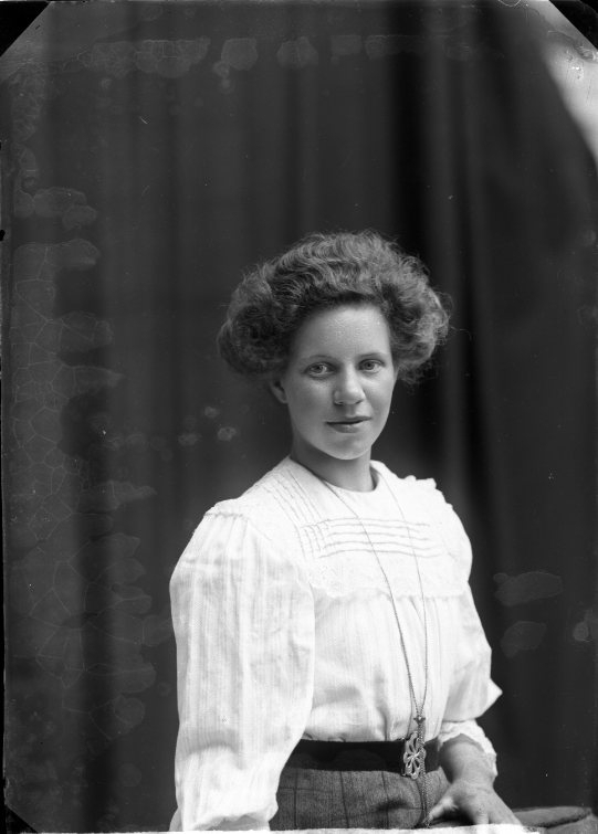 Bröstbild av en ung kvinna med ett hängsmycke runt halsen.