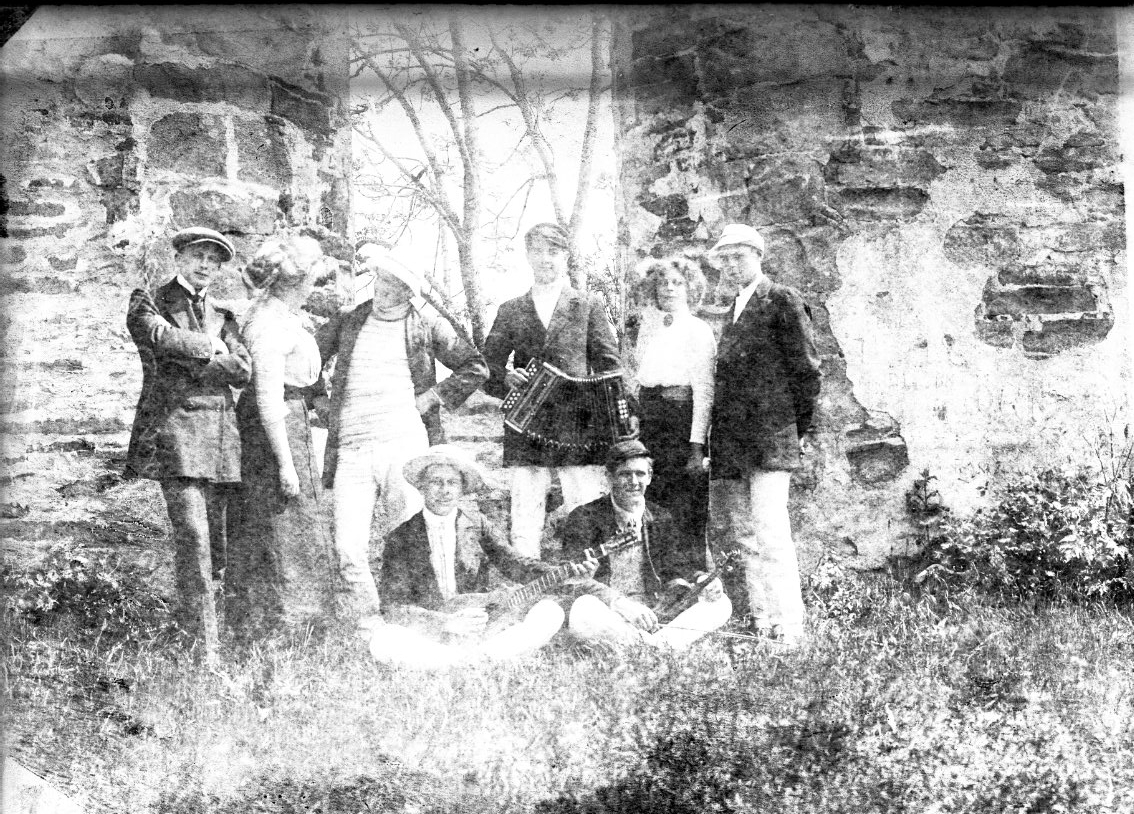 Åtta unga män och kvinnor med dragspel och gitarr i Visingsborgs slottsruin.