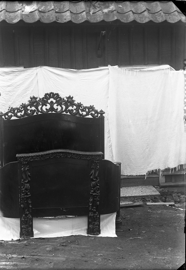 Fotografi av en säng med snidade detaljer. Den står utomhus.