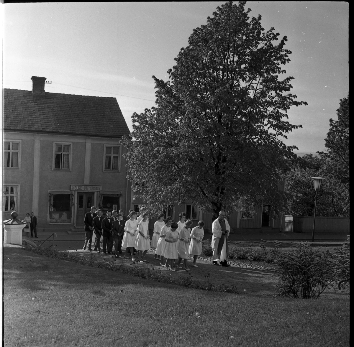 Konfirmander på väg in till Gränna kyrka med kyrkoherde Wallis Wendel i täten. Utmed Brahegatan skymtar en fastighet med skylten "Helge Peterson"
