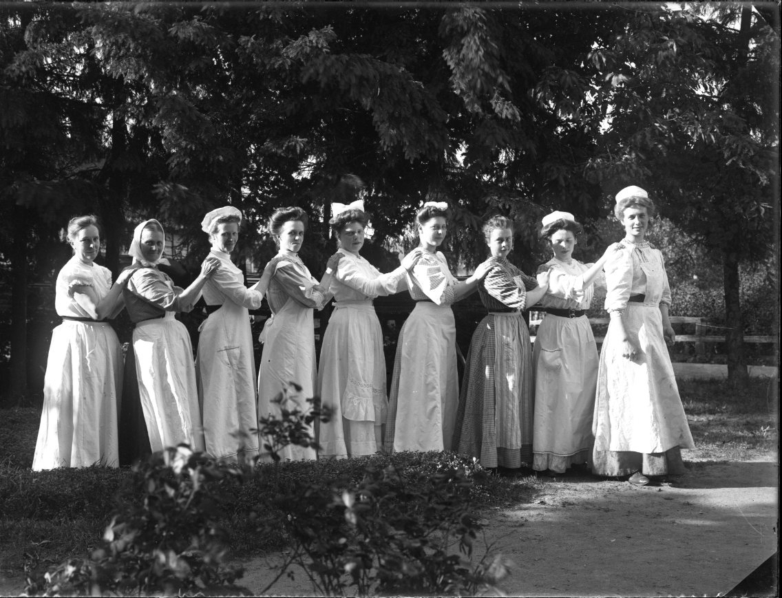 Nio kvinnor med huckle och förkläde står på ett led i en trädgård med händerna på framförvarandes axlar.