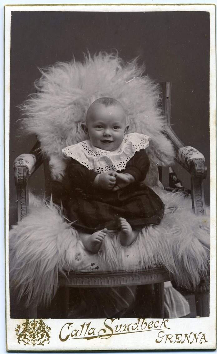 Kabinettsfotografi: porträtt av ett spädbarn som sitter på ett skinn i en stol.