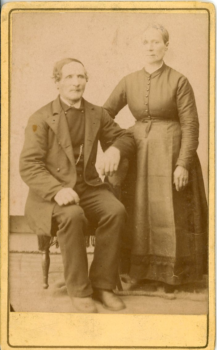 En okänd kvinna och man. Kvinnan står bredvid mannen som sitter på en stol.