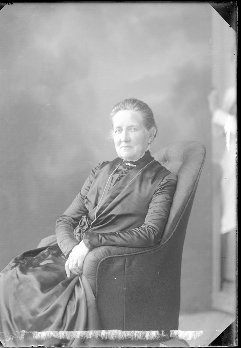 Porträtt av en äldre kvinna som sitter i en fåtölj.