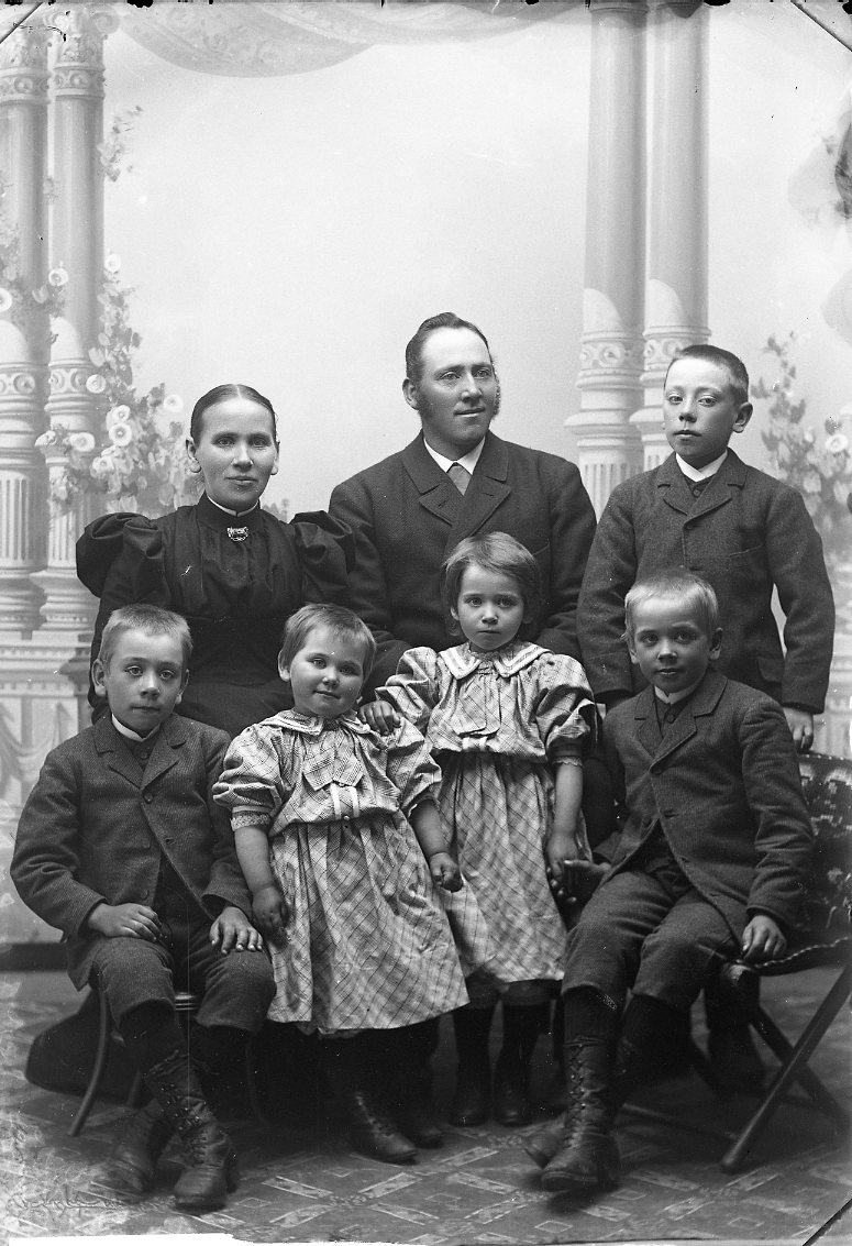 Familjen Ernst Andersson i Fattarp: föräldrar med två flickor och tre pojkar. Sittande i bakre raden är Karolina Andersson och maken Ernst Andersson. Äldsta sonen Gustav står intill. Sittande i främre raden är David, Elisabet, Edit och Erik.