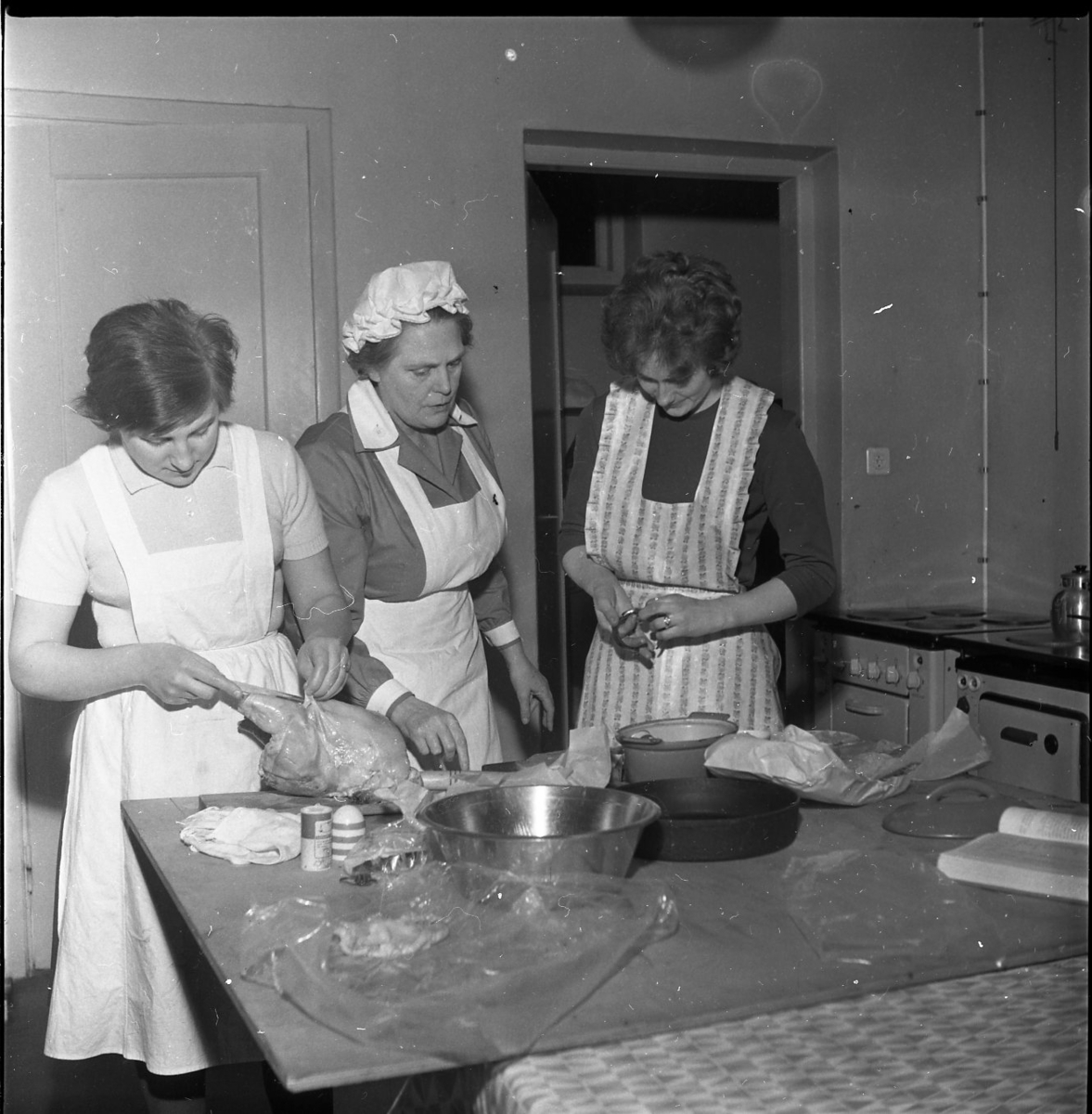 Tre kvinnor står vid ett arbetsbord och lagar mat. Alla bär förkläden. På bordet framför dem står byttor, kastruller och stekpannor. Matlagningskurs på Örserums brunn 1962.
