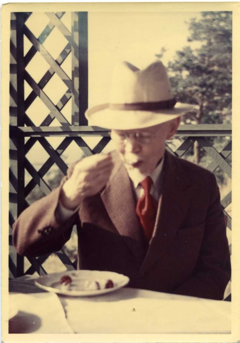 En äldre man med glasögon, ljus hatt och röd slips. Han sitter vid ett bord utomhus och äter möjligen bär från en tallrik.