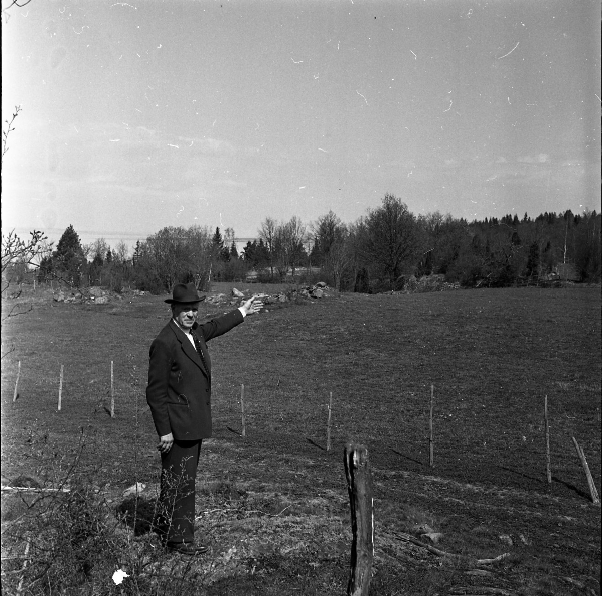 En man står på en bergskulle. Han gestikulerar med armen mot ett landskap där en ny motorväg ska byggas.