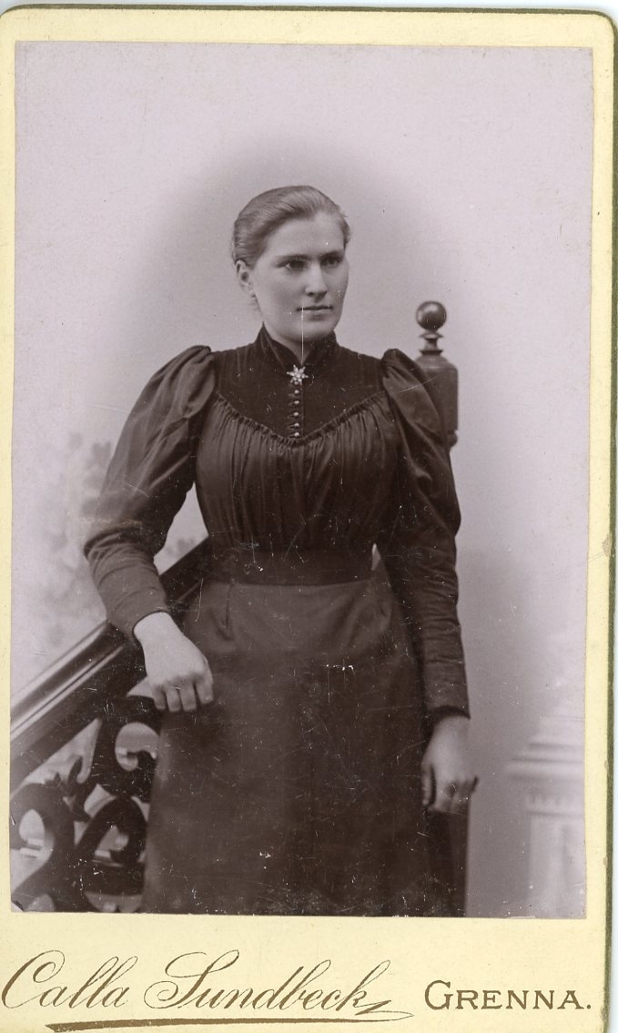 Kabinettsfotografi: en okänd ung kvinna i mörk klänning står vid ett räcke