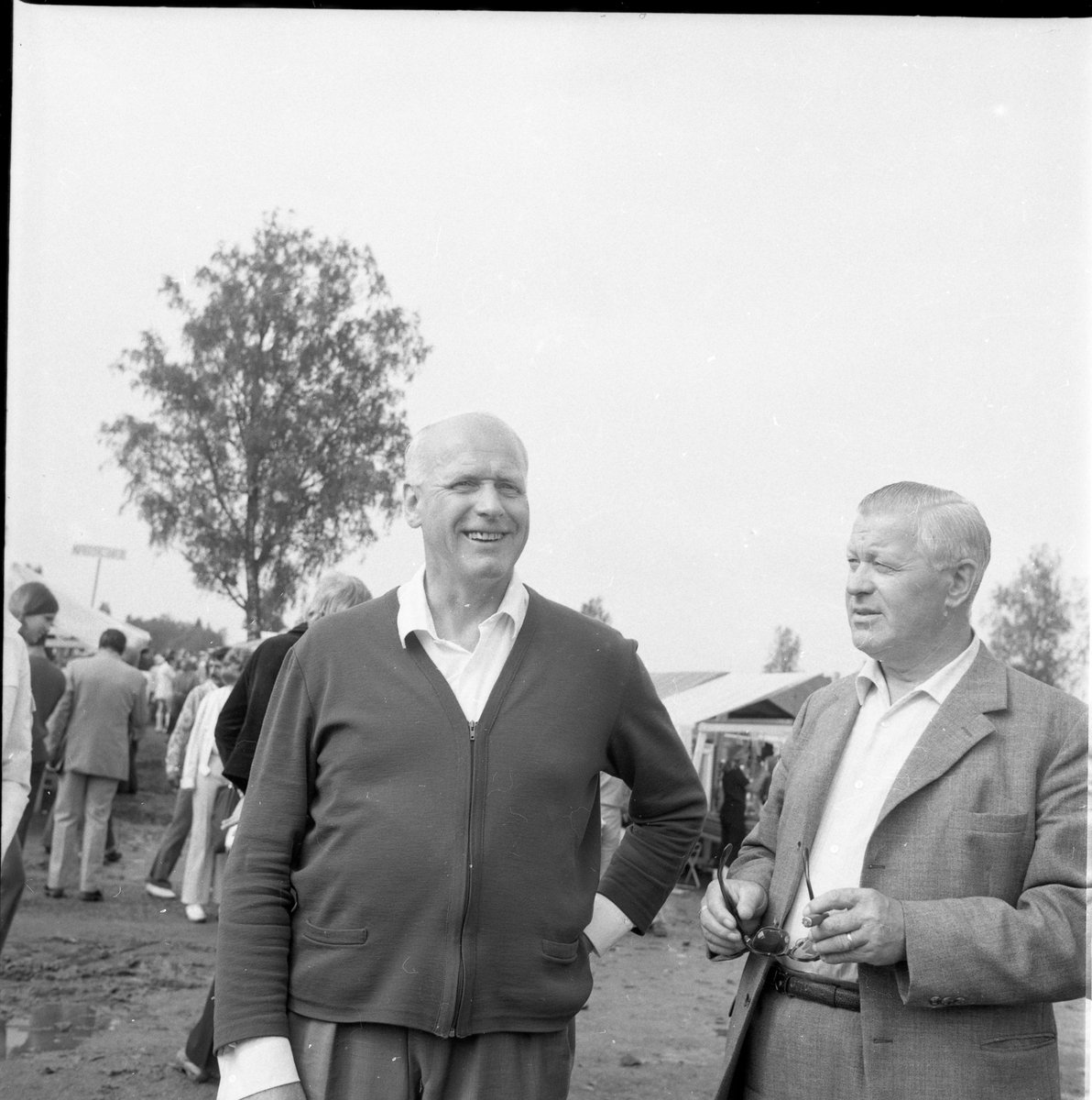 Två män samtalar på ett marknadsområde.