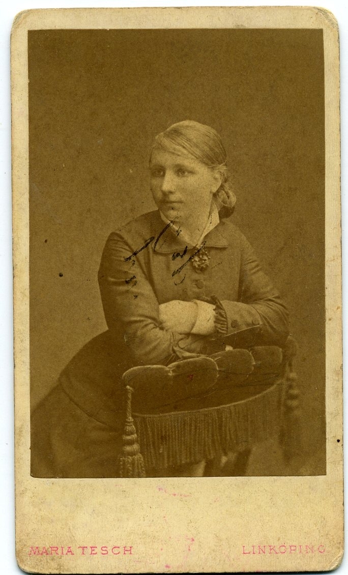 Kabinettsfotografi: porträtt av okänd kvinna som sitter bakvänd på en stol.