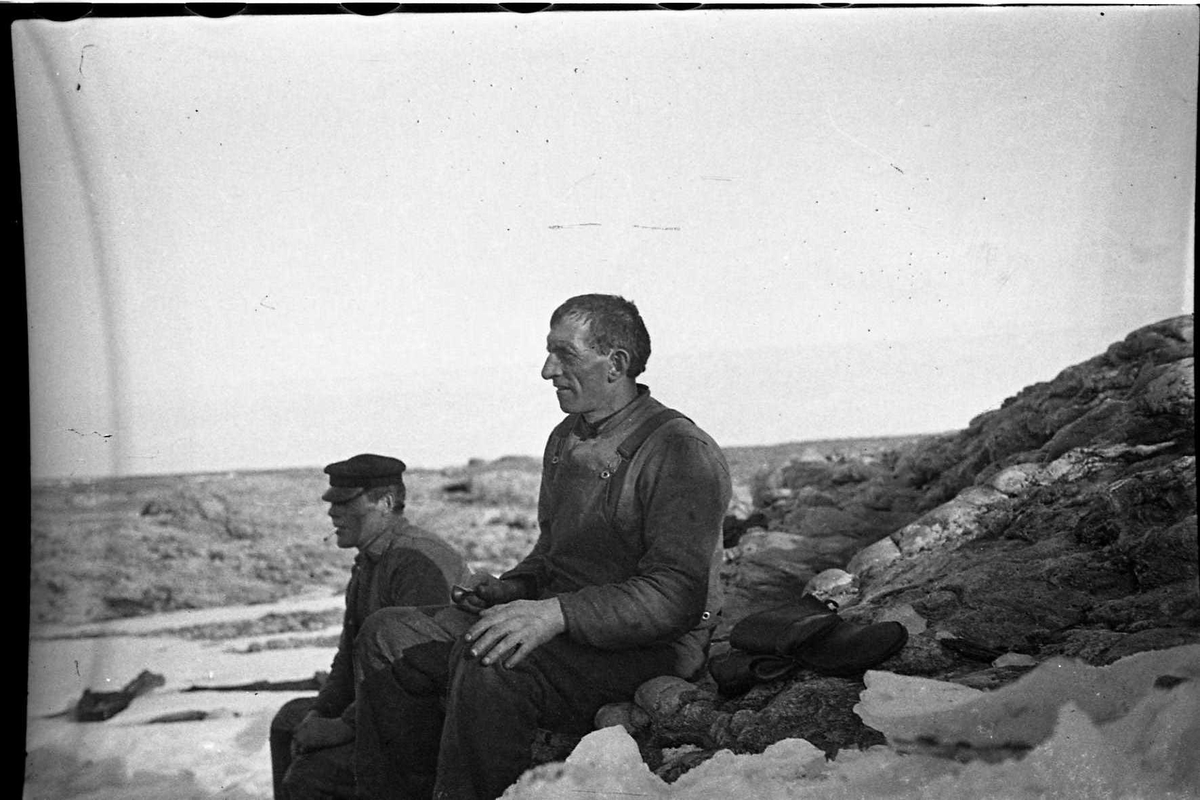 Matrosen Gudmundsen och skepparen Skogvik från Isbjörn vid fyndplatsen på Vitön.