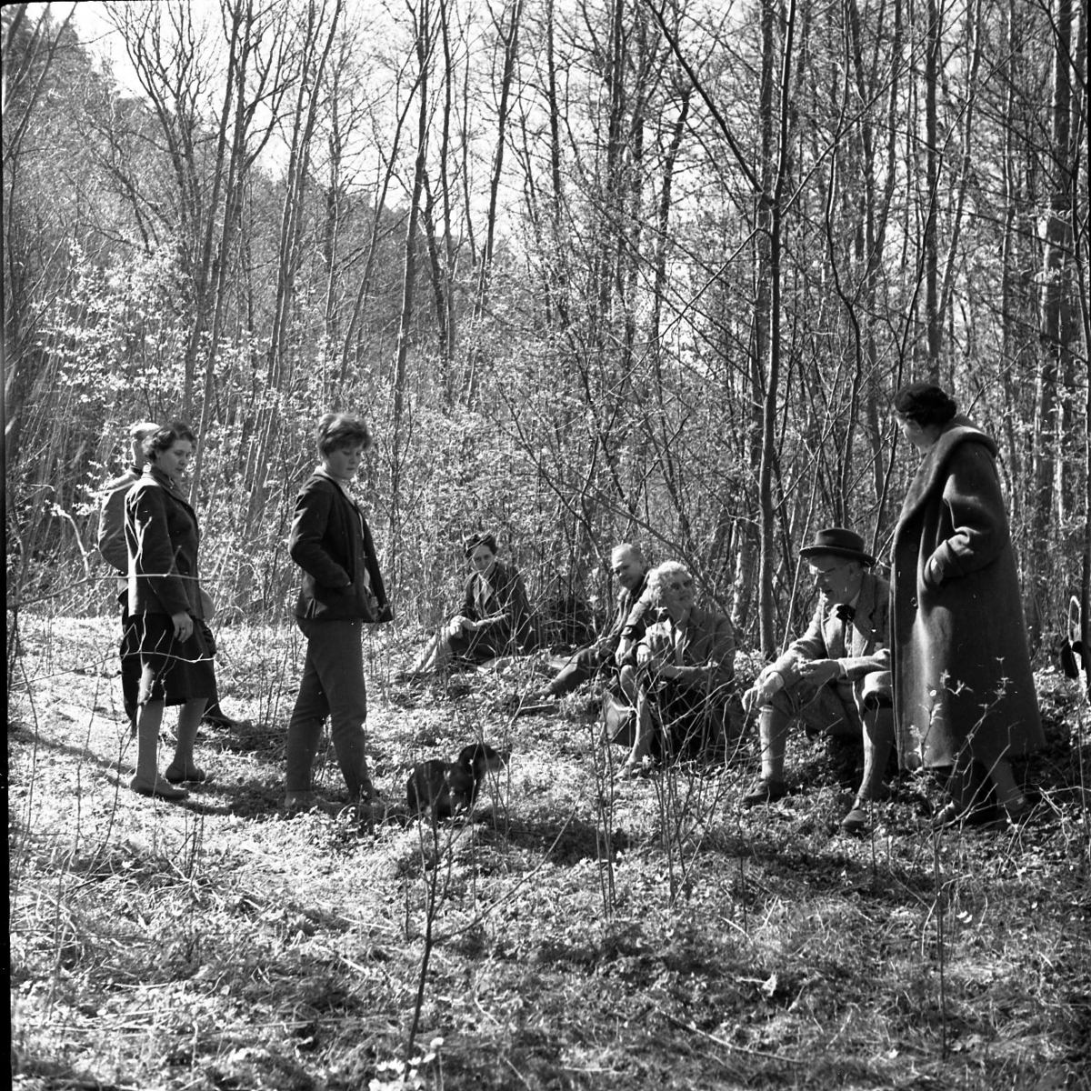 Kvinnor och män i en solig skogsglänta.