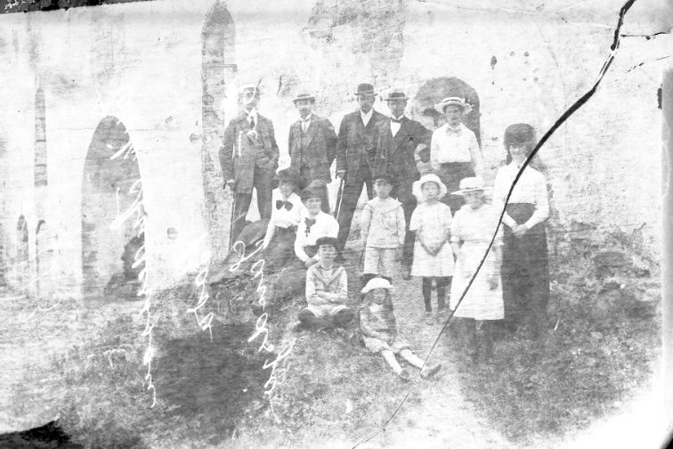 Ett sällskap vuxna och barn står och sitter på en kulle intill Visingsborgs slottsruin.