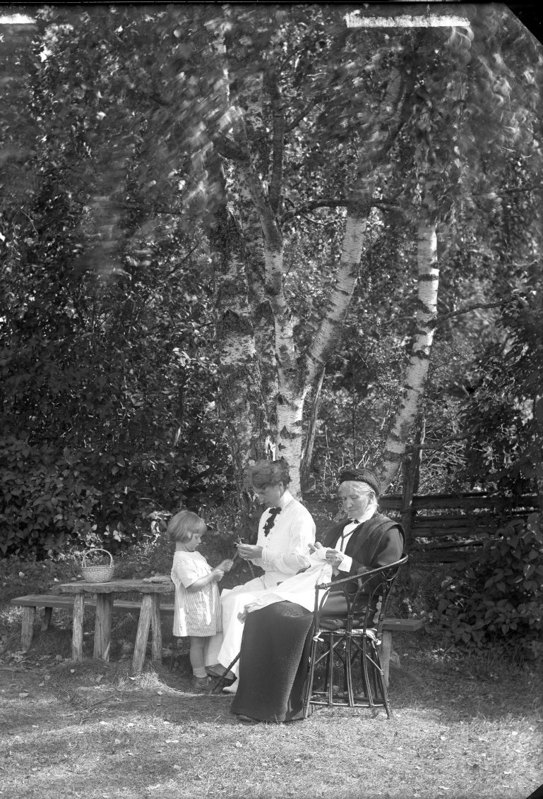 Under en björk sitter en äldre kvinna i mörkt med ett sömnadsarbete. Till vänster om henne en yngre kvinna i ljust och ett litet barn. Den äldre kvinnan till höger är troligen "friherrinnan Falkenberg" från Stockholm.