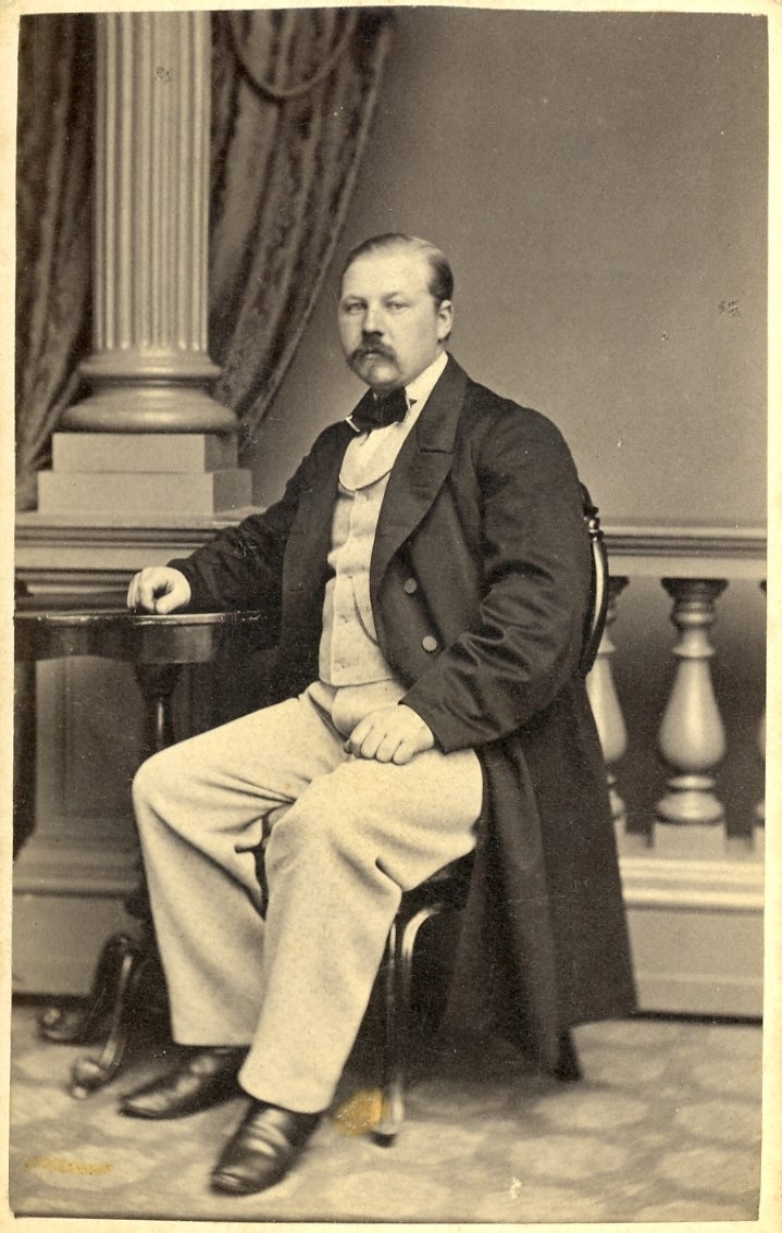 Kabinettsfotografi av en ung man med mustasch som sitter vid ett bord.