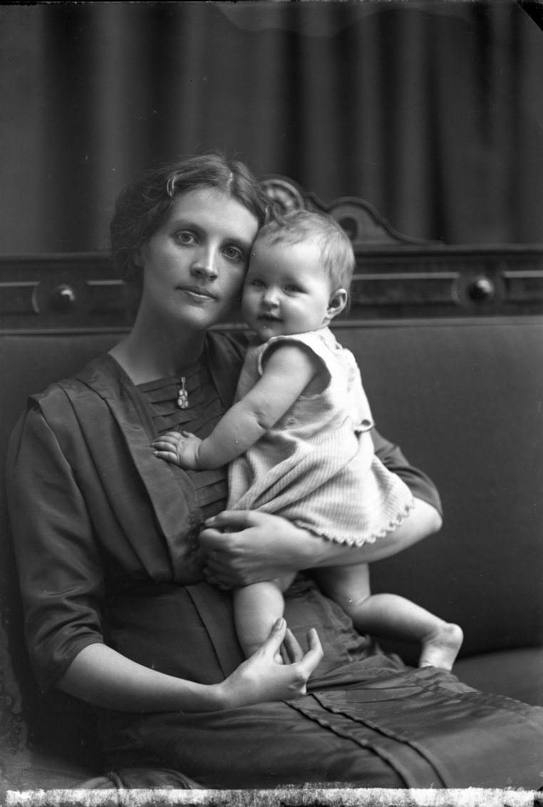 Porträtt av en ung kvinna med ett litet barn i famnen.
