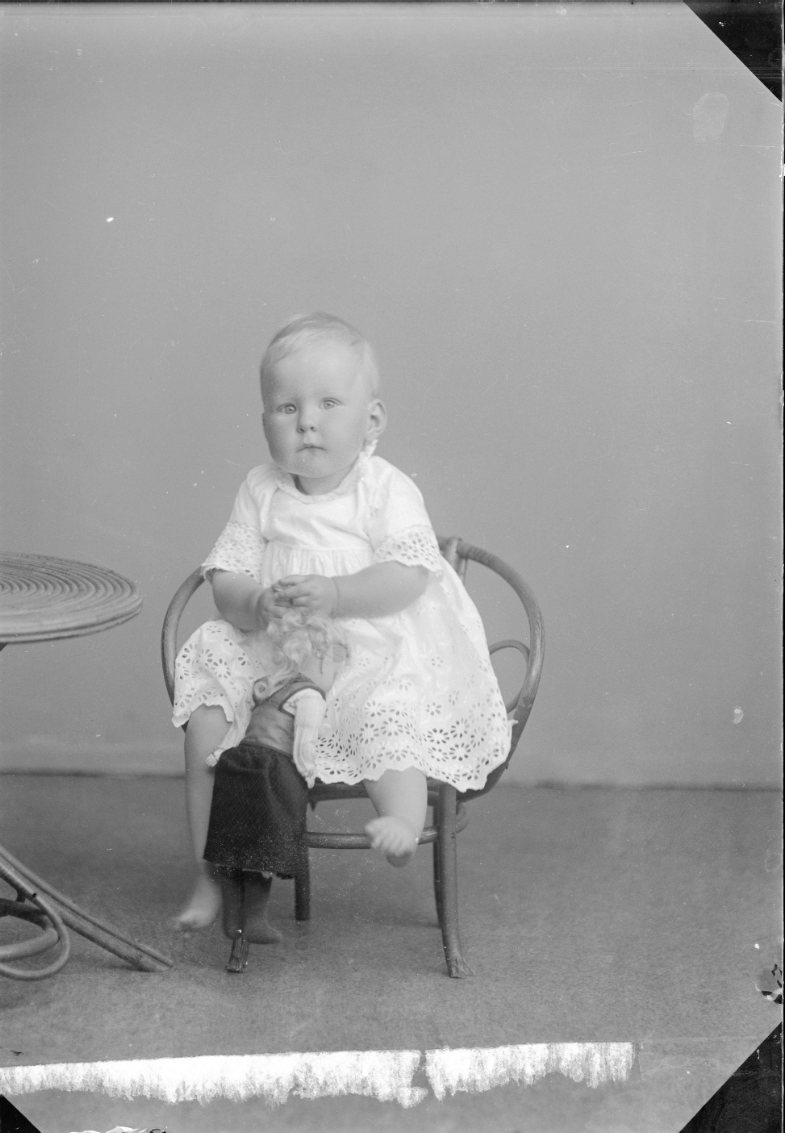 Ett litet barn sitter i en liten stol med en docka i händerna.