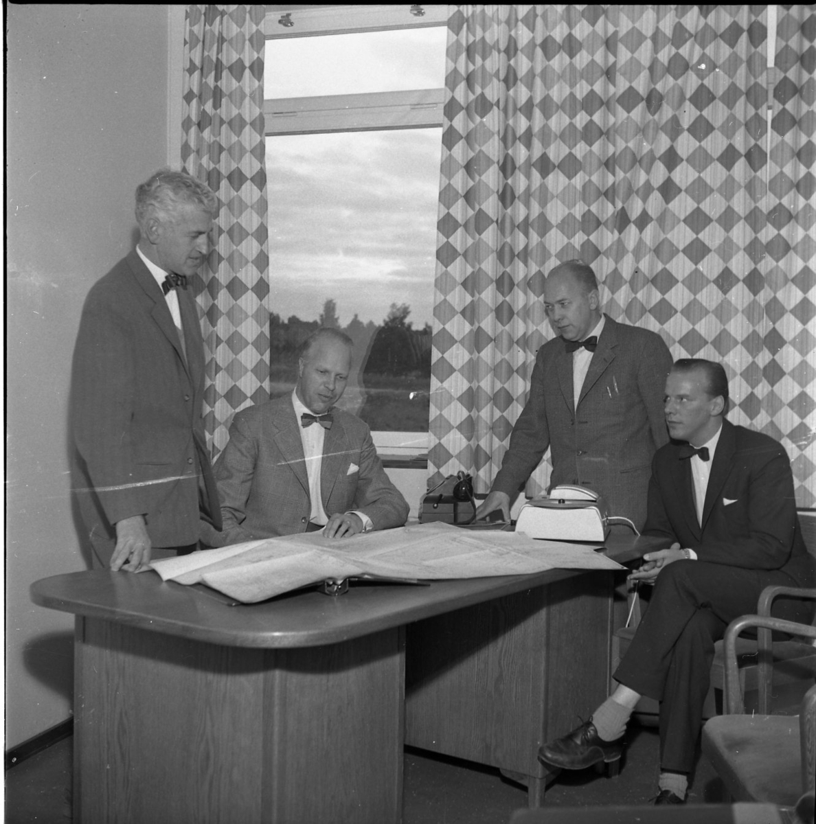 Fyra män samlade runt ett bord där det sannolikt ligger en ritning. Man befinner sig sannolikt på Rifa-fabriken. Fönsterna är delvis fördragna med rutmönstrade gardiner.