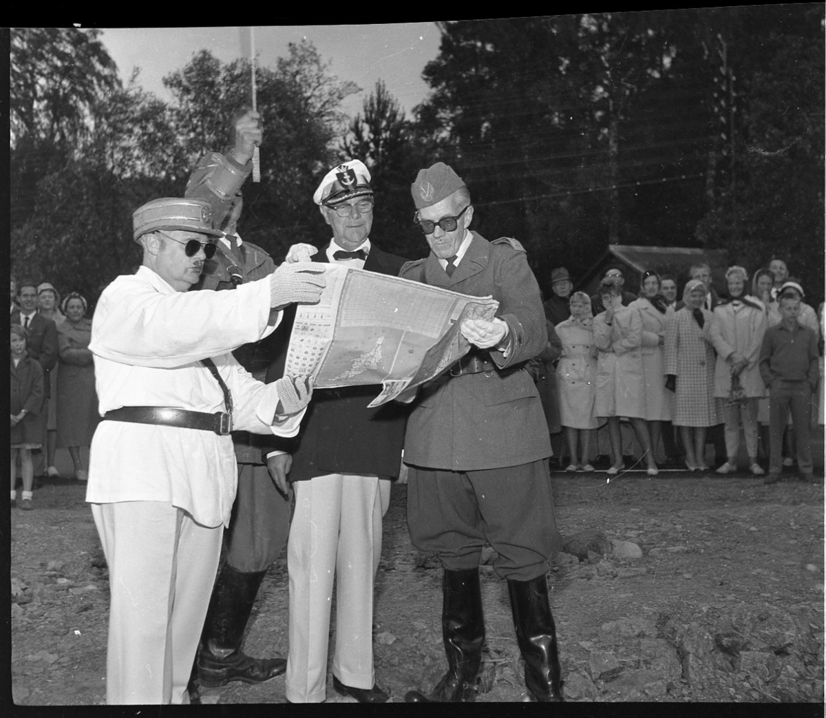 Spex i samband med Osse Gustafssons 60-årsdag. Han står i mörk kavaj, ljusa byxor och vit skärmössa flankerad av två andra män. De tittar på en karta. I bakgrunden står en publik av män och kvinnor.