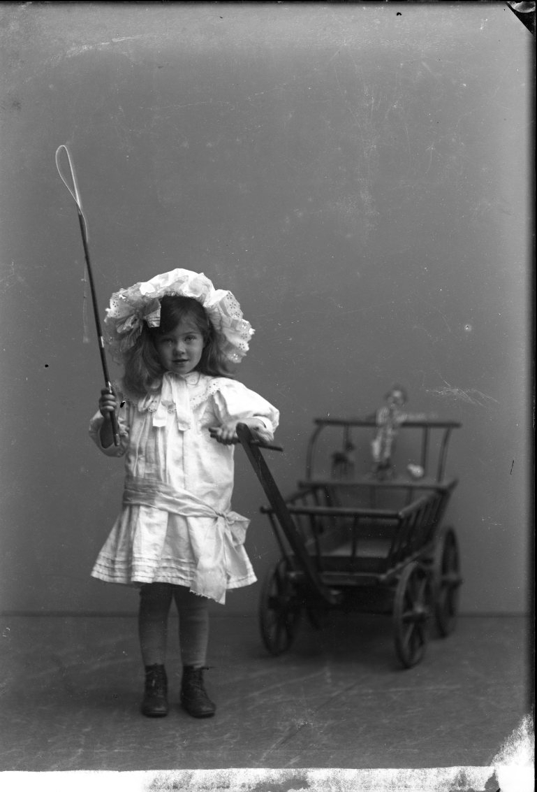 Porträtt av en liten flicka som håller i en liten åkvagn för barn och en piska.