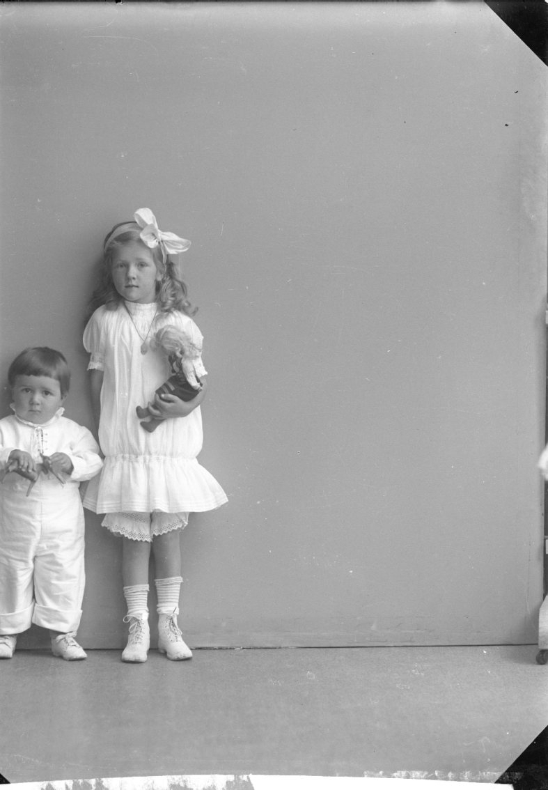 Gruppbild med två små barn. Den äldre flickan håller en docka i famnen. Glasplåten är sannolikt avklipp till vänster.
