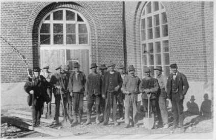 13 män, flera med skyfflar, står framför Röttle Kraftstation söder om Gränna.