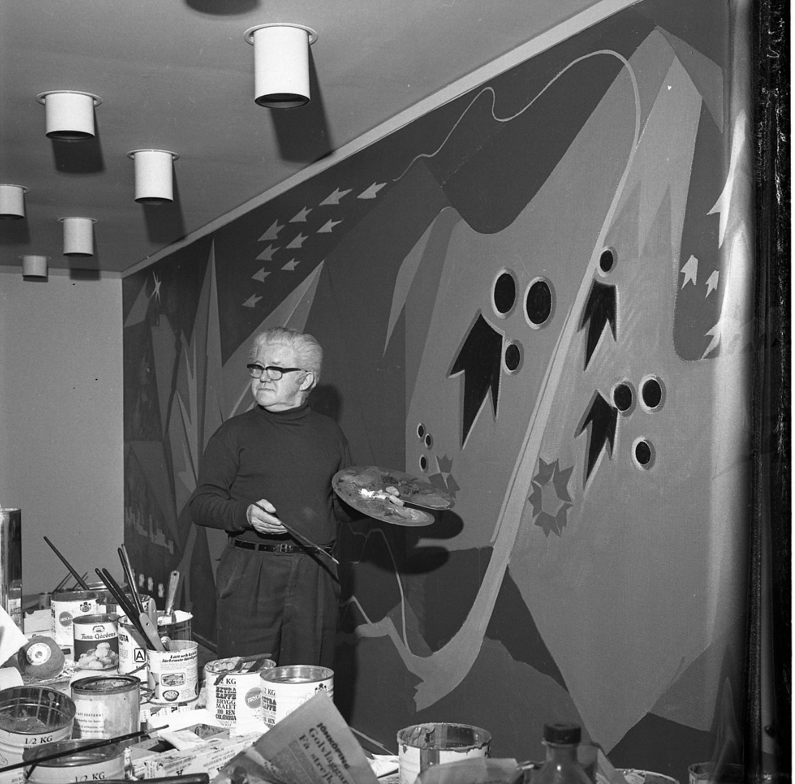 Georg Trapp arbetar vid en stor väggmålning. Färgburkar står på en bänk framför honom.