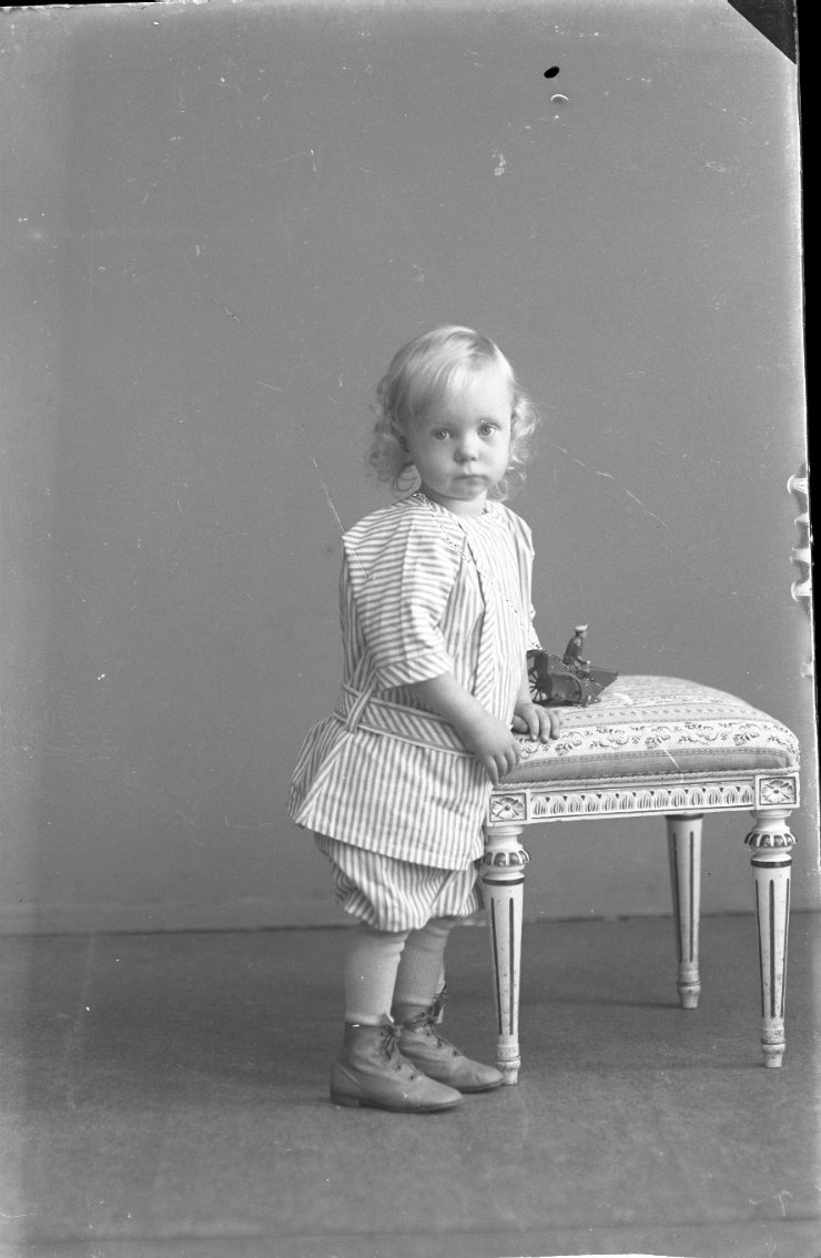 Porträtt av en liten pojke som står lutad mot en pall av gustaviansk modell. På pallen står en leksak.